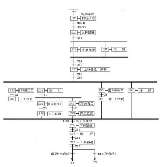 下图是组合机床控制系统全自动工作循环和半自动工作循环式的状态流程图。图中S2是初始状态,驱动它的条件是各滑台、各辅助装置都处在原位,夹具为松开状态,料道有待加工零件且润滑系统工作正常,关注公众号三〇智工,技能人才就业一步到位以及企业免费发布招聘岗位。